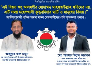 কক্সবাজার-২ (মহেশখালী–কুতুবদিয়া) সংসদীয় আসনে বাংলাদেশ জাতীয়তাবাদী দল (বিএনপি) মনোনীত ধানের শীষ প্রতীকের প্রার্থী আলমগীর মুহাম্মদ মাহফুজউল্লাহ ফরিদ বিপুল ভোটে বিজয়ী হওয়ায় মাতারবাড়ী ইউনিয়ন জাতীয়তাবাদী শ্রমিক দলের পক্ষ থেকে নেতাকর্মী ও সমর্থকদের প্রতি গভীর কৃতজ্ঞতা ও আন্তরিক অভিনন্দন জানানো হয়েছে।