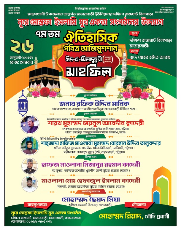মহেশখালী উপজেলার মাতারবাড়ী ইউনিয়নের দক্ষিণ রাজঘাট বিলপাড়া এলাকায় নূরে মোস্তফা ইসলামি যুব একতা সংগঠনের উদ্যোগে ৭ম ঐতিহাসিক পবিত্র আজিমুশশান ঈদে মিলাদুন্নবী (সা.) মাহফিল অনুষ্ঠিত হতে যাচ্ছে।